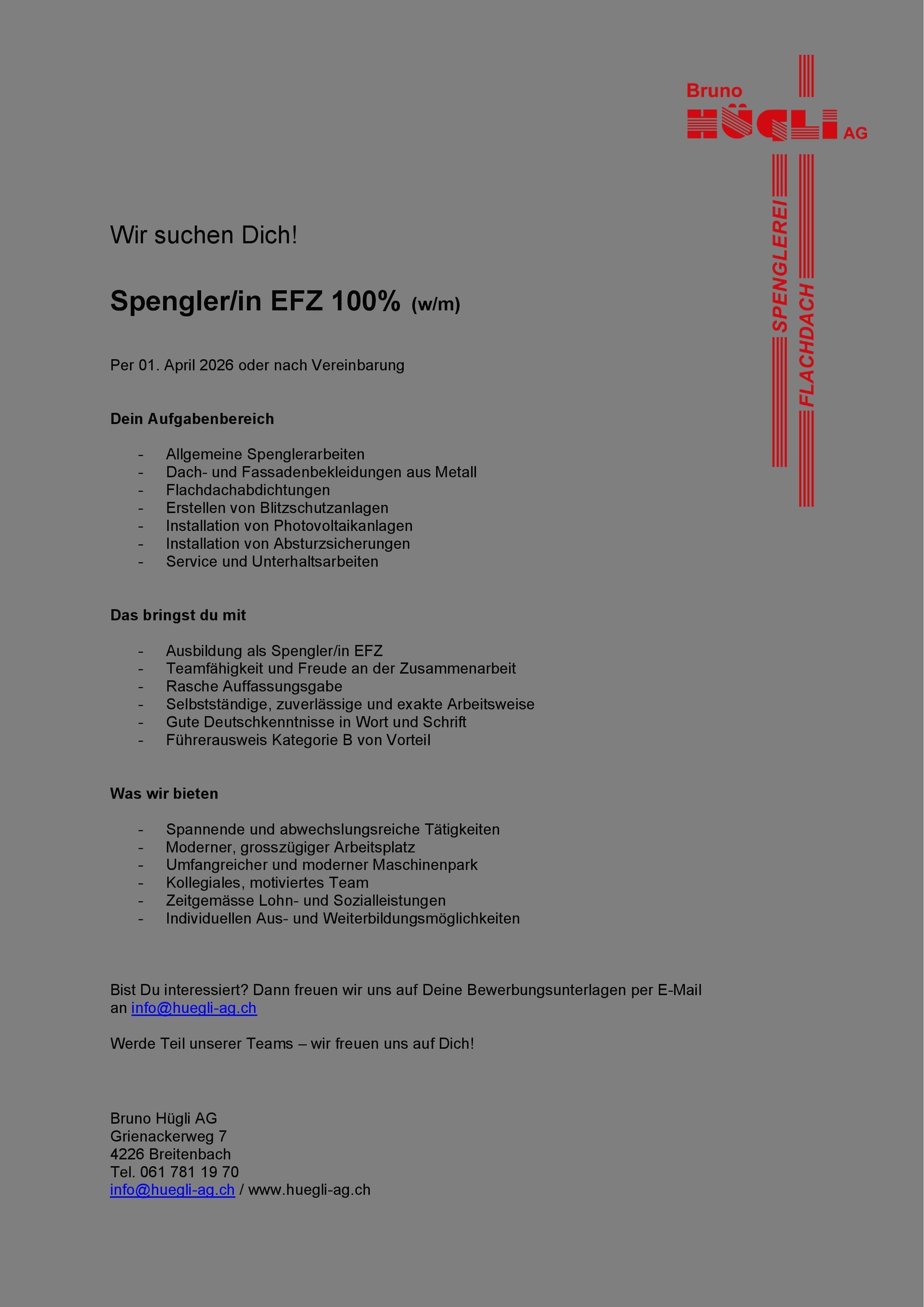 Wir die Bruno Hügli AG, sind Ihr Partner für Spengler- und Flachdacharbeiten, Blitzschutz (VKF zertifiziert) und hinterlüfteten Fassaden bei Neubauten, Umbauten und Sanierungen.
