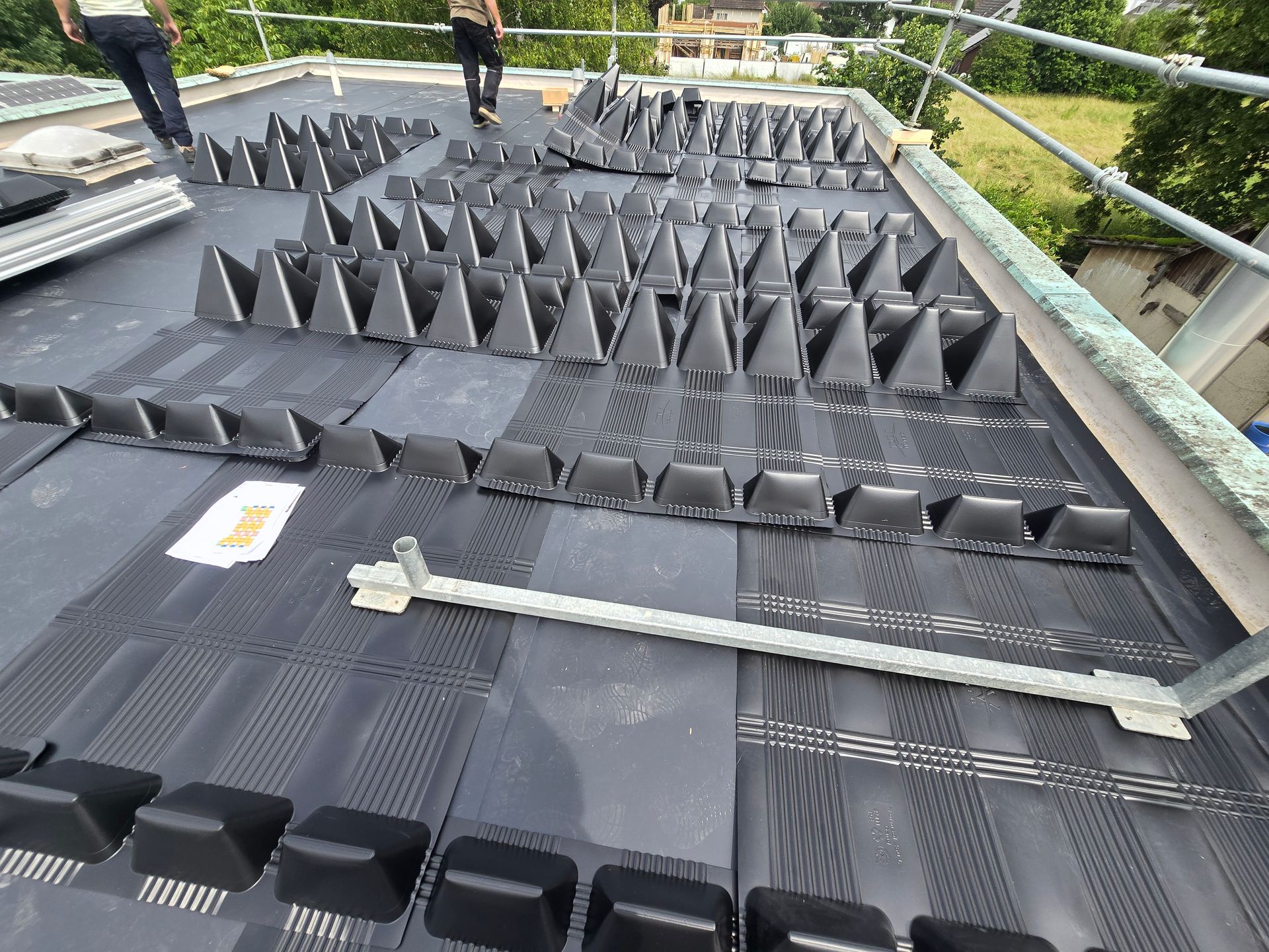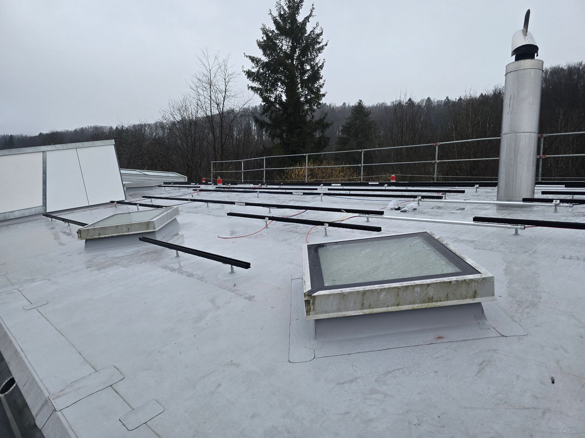 PV-Montage auf einem Flachdach mit Kiesauflastung